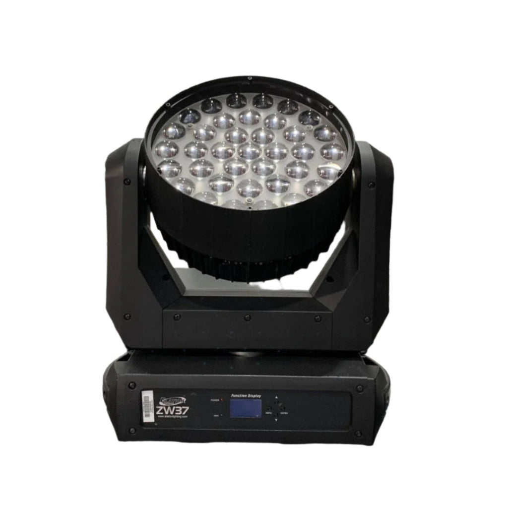 The ZW37™ is an LED moving head beam/wash effect luminaire featuring (37) 15W RGBW 4-in-1 LEDs, motorized 10° to 60° zoom, 64 color macros, fast and precise 540° pan and 220° tilt rotation, 16-bit fine resolution adjustable movement, strobe, and selectable dimming curve effects, 3/5pin XLR and powerCON in/out connections, (4) button control LCD menu display, 715W max power consumption, and a multi-voltage universal auto switching power supply (100-230v).