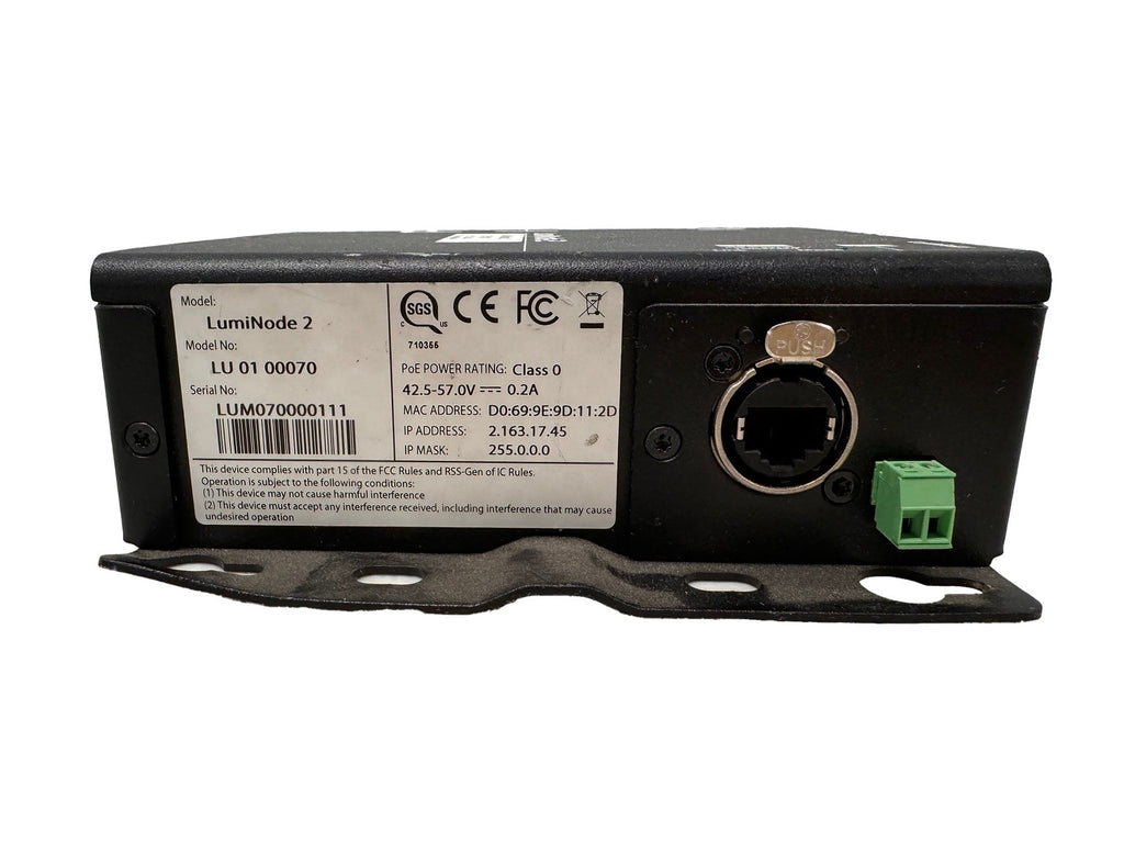 Le LumiNode 2 est un nœud DMX-Ethernet compact et robuste, conçu pour les installations fixes et les tournées. Logé dans un boîtier métallique durable, il offre des options de montage flexibles sur barres de suspension ou murs. Doté de deux ports EtherCON Gigabit et de deux ports DMX 5 broches entièrement configurables (entrée ou sortie), il prend en charge le routage avancé, la fusion et la conversion de protocoles, ce qui le rend idéal pour les théâtres, les studios et les réseaux d'éclairage complexes.