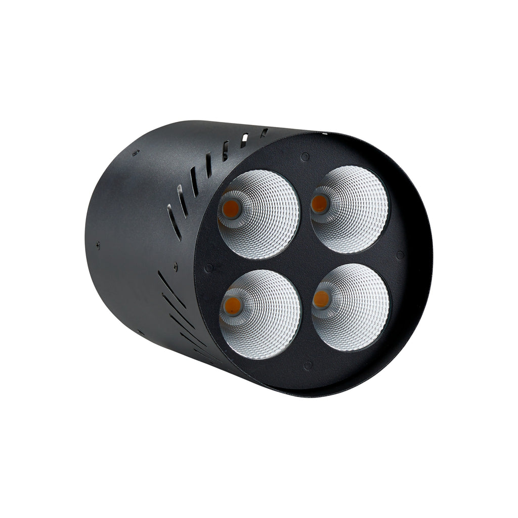 The compact, Pro Four-Cell Round is ideal for use in medium- to long-throw, pendant style applications. The luminaire is supplied with half-inch and M10 captive nut plates for connecting threaded rod, providing multiple hanging options. Manufactured from highgrade, powder-coated aluminum and steel, the luminaire is entirely convection cooled for silent operation.